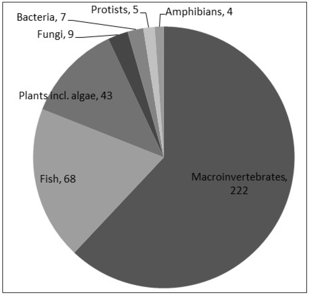 We retained and evaluated 326 papers from our original literature search. For a complete list of the papers we retained see Supplementary Documentation. While there was a diverse range of focal organisms in biodiversity research in lotic systems overall, macroinvertebrates were overwhelmingly the most frequently investigated group (Figure 1). There was also a strong focus on fish (19%), and plants represented 12% of studies. Cumulatively, these 3 general taxonomic groups represented 94% of the total studies reviewed. While some studies investigated fungi, protists, rotifers, bacteria, and amphibians, they represented a slim minority of studies. We did not observe any trends in the choice of study organism as a function of time.