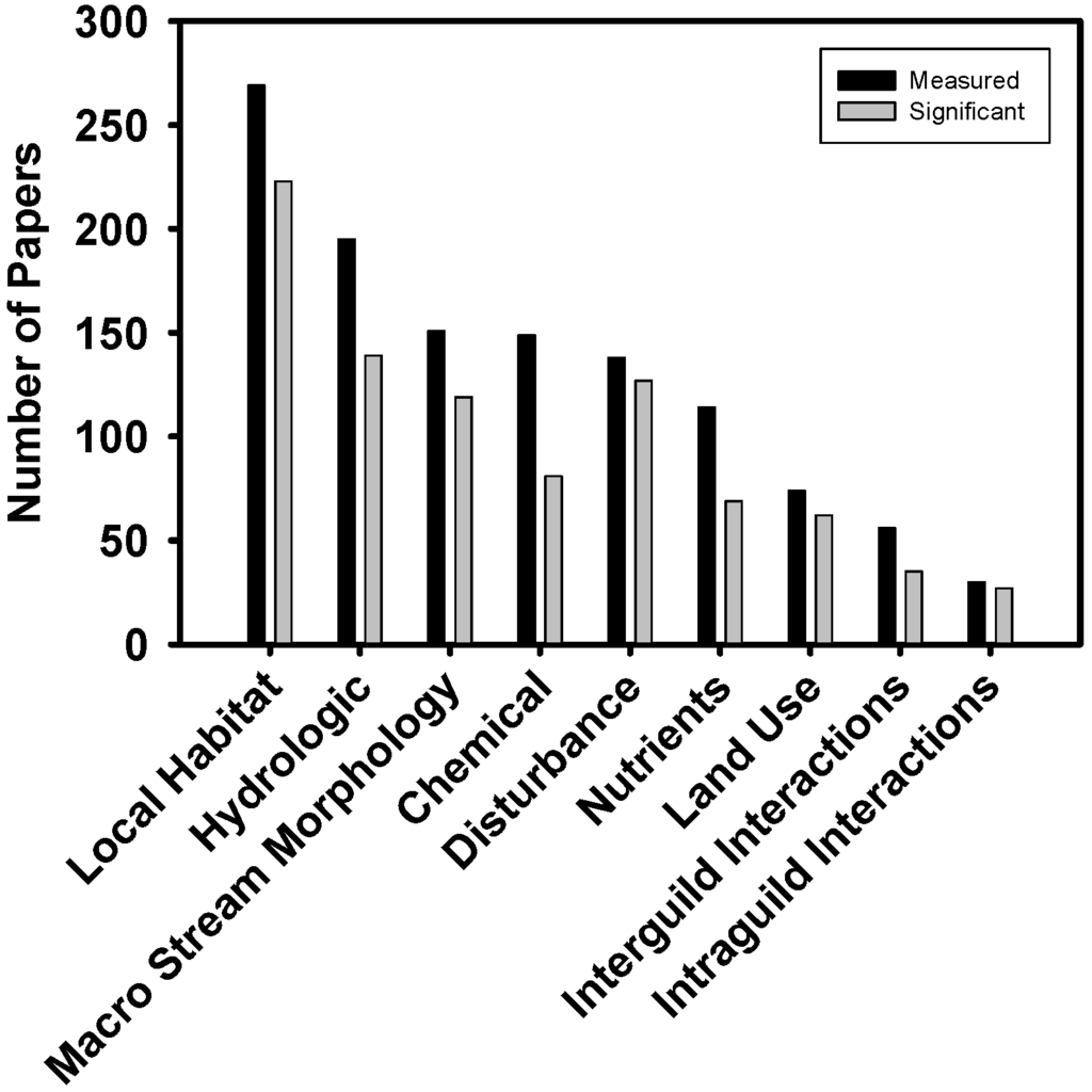 We found varying amounts of attention and support for commonly measured predictors of biodiversity. Local habitat was the most commonly reported predictor variable as well as the most frequent significant predictor of biodiversity (Figure 2). Hydrologic variables, macro-scale stream morphology, and disturbance were the next most commonly reported predictor variables. For most predictors, the large majority of studies considering that predictor found a significant effect, with the exceptions of chemical and nutrient variables (Figure 2).