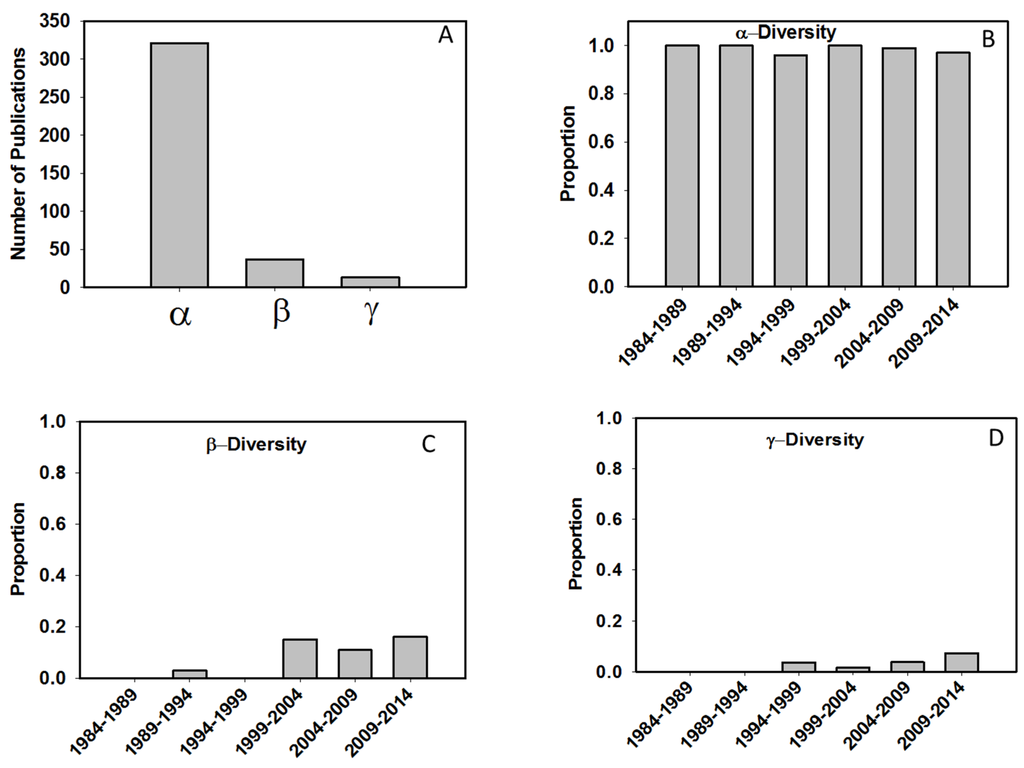 (A) The number of publications in which α, β, and γ diversity were the focal points of studies; (B–D) The proportion of papers as a function of time that examined (B) α-diversity; (C) β-diversity; and (D) γ-diversity.