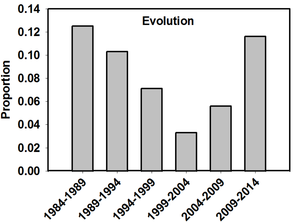 Evolutionary studies of stream biodiversity have remained relatively rare throughout the past decades, but showed a punctuated decline throughout the 1990s and subsequent resurgence in recent years. Studies in which evolution was invoked as a causative agent to explain patterns of lotic diversity made up approximately 12% of papers in the mid to late 1980s and dropped to less than 4% in the early 2000s and rose again to around 11% in recent years (Figure 4).