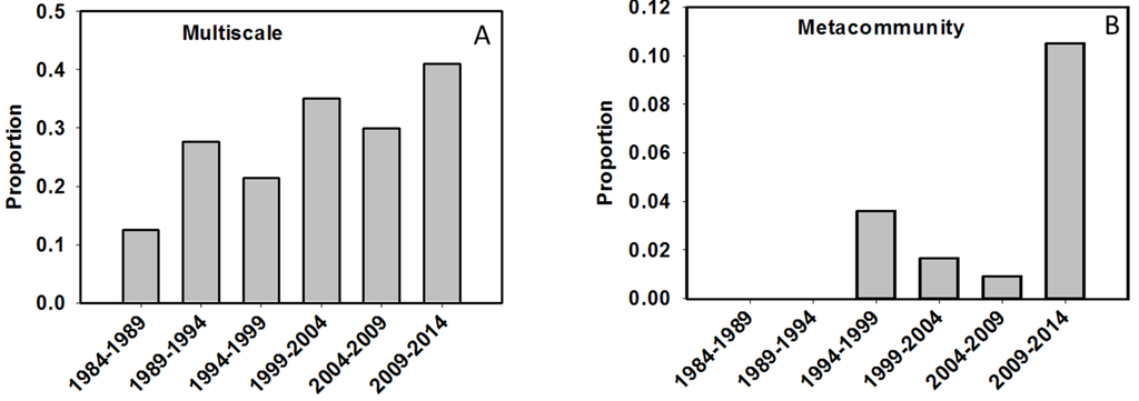 With regard to the choice of scale at which to investigate biodiversity, α-diversity, or diversity of a single locale, was by far the most utilized scale with 87% of studies examining alpha diversity and most studies focusing only on α-diversity (Figure 3). Several types of metrics were commonly employed at this scale, including species richness and various metrics of diversity (e.g., Shannon) and evenness (e.g., Simpson). Relatively few studies investigated β- or γ-diversity (i.e., turnover and regional diversity respectively). However, one particularly interesting result was a dramatic increase in studies including β and γ during recent years. The proportion of studies incorporating these larger-scale measures is still low; a maximum of 16% for β and 7.5% for γ, but the increase is noteworthy. We saw a similar trend with regard to studies that were explicitly designed as multi-scale, with an increase from 11% in the ’84–’89 interval to nearly 40% in the most recent 5 years (Figure 5a). This dramatic increase in interest in multi-scale patterns closely coincides with a general movement in ecology to incorporate processes at multiple spatial scales. In particular, the Metacommunity Concept—a framework that incorporates both local scale processes (e.g., species interactions and environmental filtering) and the regional-scale processes driven by the dispersal of organisms—has come to dominate much of the thinking of community ecologists within the general discipline of ecology [53,54,55,56,57], and specifically in stream ecology [18,29,33,37,48,58,59,60,61,62,63,64].