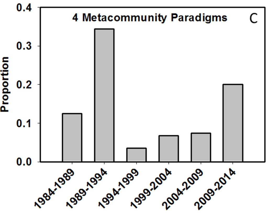 The rise in influence of metacommunity theory is obvious from the increase in use of language associated with metacommunity ecology. Appearance of the specific terms “metacommunity” or “metacommunities” has increased dramatically in the last five years, with currently over 10% of studies referencing metacommunity theory, whereas in the previous time interval (2004–2009) less than 1% of studies referenced metacommunity theory (special recognition to Chris Taylor who, in 1997, appears to be the first stream ecologist to reference the term “metacommunity” [65], seven years prior to the publication of Leibold et al. 2004, the seminar paper on metacommunity ecology) (Figure 5b). Likewise, references to the four paradigms associated with metacommunity theory has generally increased since 1994 (Figure 5c). However, an exception to the general trend is that in the 1989–1994 interval, use of the term “patch dynamics” was extremely common, appearing in 35% of studies on biodiversity although at the time, patch dynamics meant something slightly different that its most common current use. This result was actually not surprising, and when the same data are examined on a finer temporal scale, examining every citation year individually, a similar spike can be observed in the early 2000s with regard to neutral theory. These temporal trends occur because the four paradigms commonly associated with metacommunity theory all pre-date the metacommunity concept and were not formalized as part of the metacommunity concept, despite many misleading references in current literature. The four paradigms were simply grouped together as historical paradigms that all fall under the purview of unified metacommunity theory [57].