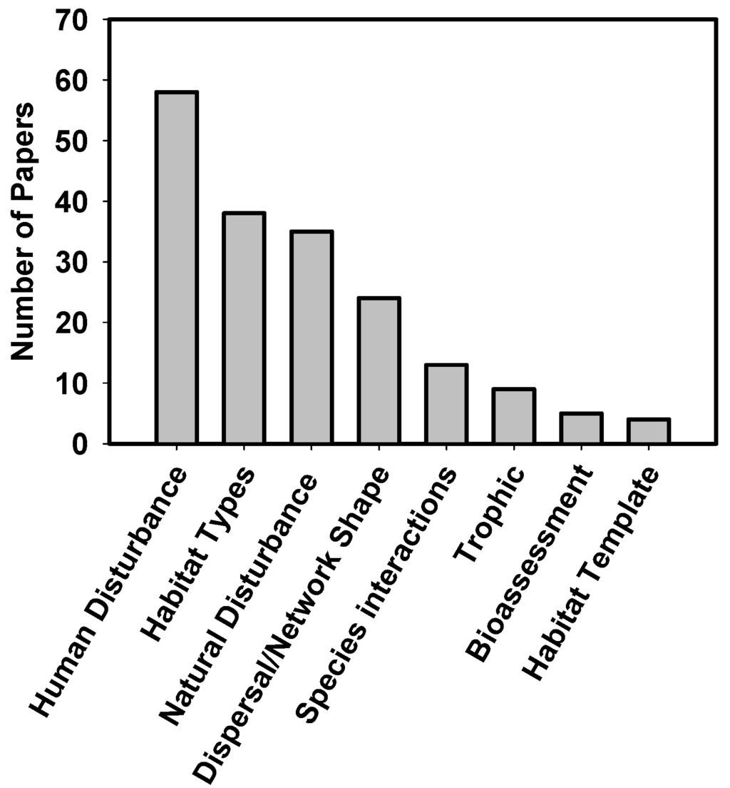 Human disturbances including mining activity, land use changes, pollution, and dams were the most common theme with regards to investigations of stream biodiversity (Figure 6). Habitat type and associated manipulations of habitat was the second most common theme, followed by natural disturbances like floods and droughts. Dispersal of organisms and connectivity within stream networks was a theme in over 20% of studies, while species interactions, trophic studies, bioassessment and investigations of habitat template frameworks constituted a minority of studies.