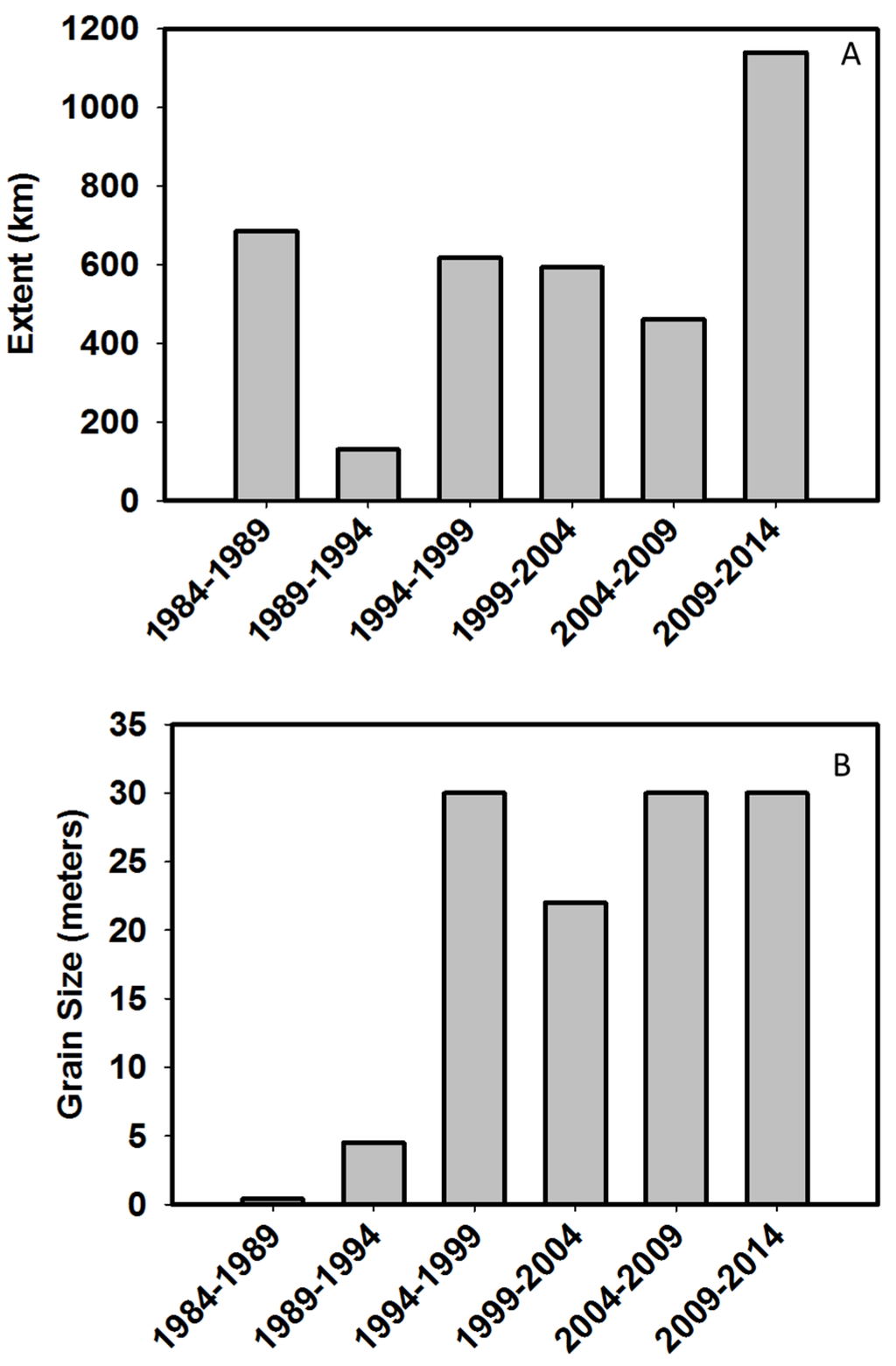 The extent of studies has remained fairly constant over the 34-year period with the exception of a sharp increase in the last five years. Grain size, i.e., the level of inference, increased sharply from the mid-1980s to the late-1990s, after which it has remained fairly constant at a median size of 25–30 m (Figure 7).