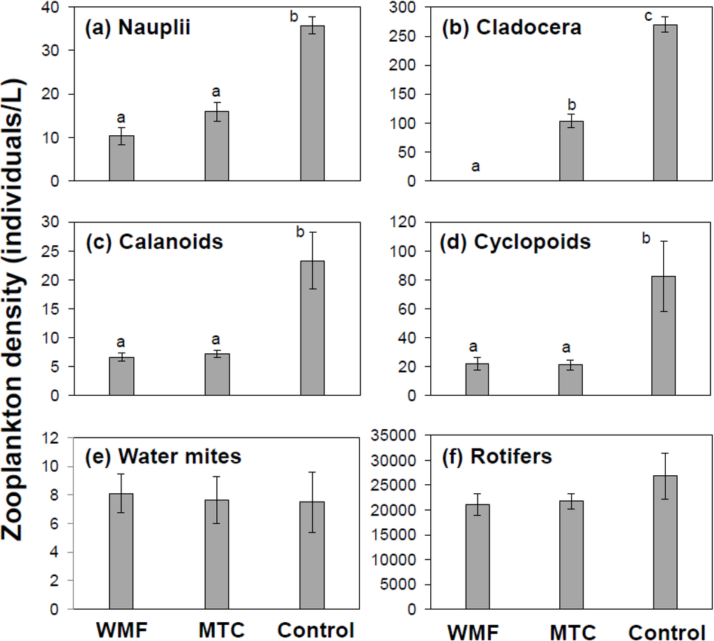 Differences in mean density of major zooplankton taxa among treatments. Significant differences of mean densities were observed for (a) crustacean nauplii (X23 = 12.67; p = 0.002); (b) cladocera (X23 = 21.47; p < 0.001); (c) calanoid copepods (X23 = 11.76; p = 0.003); and (d) cyclopoid copepods (X23 = 9.80; p = 0.007). No significant treatment differences were observed for (e) water mites and (f) rotifers. Treatment codes: WMF = allopatric mosquitofish, MTC = allopatric tui chubs, and Control =fishless control. Error bars are one standard error. Similar upper case letters on top of bars indicate non-significant pair-wise comparisons after Bonferroni correction.