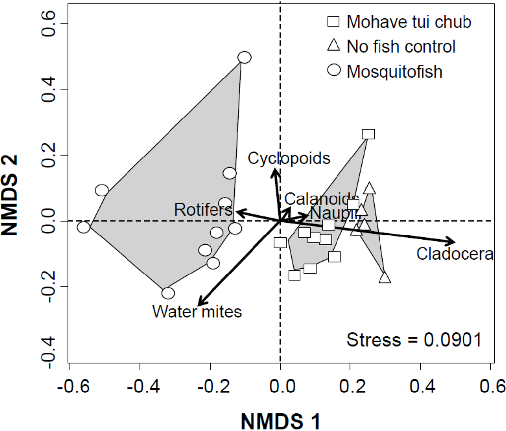 Nonmetric multidimensional scaling (NMDS) ordination plot of experimental units (= mesocosms) for all six-taxa of zooplankton (stress = 0.0901). Fish impacts are shown by having separate clusters for treatments with and without fish. Different symbols show three treatments; squares = mosquitofish, circles = Mohave tui chub, and triangles = fishless controls. Symbols represent individual mesocosms and the relative distance between two symbols represent the similarity (or dissimilarity) of zooplankton composition in the relevant mesocosms. Angles and lengths of the vectors represent the direction and the strength of responses of invertebrate taxa to ordination scores, respectively.