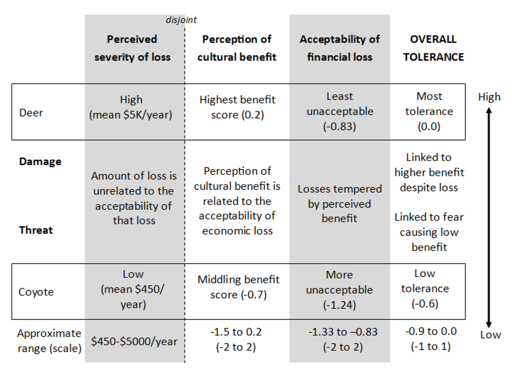 We used an elicitation-style survey to understand what motivates farmers to accept co-existence with some wildlife but not others. The four most commonly listed nuisance species were not surprising: deer, coyote, raccoon, and bear. This study was undertaken during a time of heightened farmer complaints about nuisance species, especially deer, and increased media coverage of coyote sightings in peri-urban areas. Farmers perceived species they saw as causing damage, such as deer, very differently from those that posed a threat, such as coyote. These two species serve as useful archetypes for understanding the dynamics because they were exclusively considered one or the other, and are used as examples here (Figure 2).