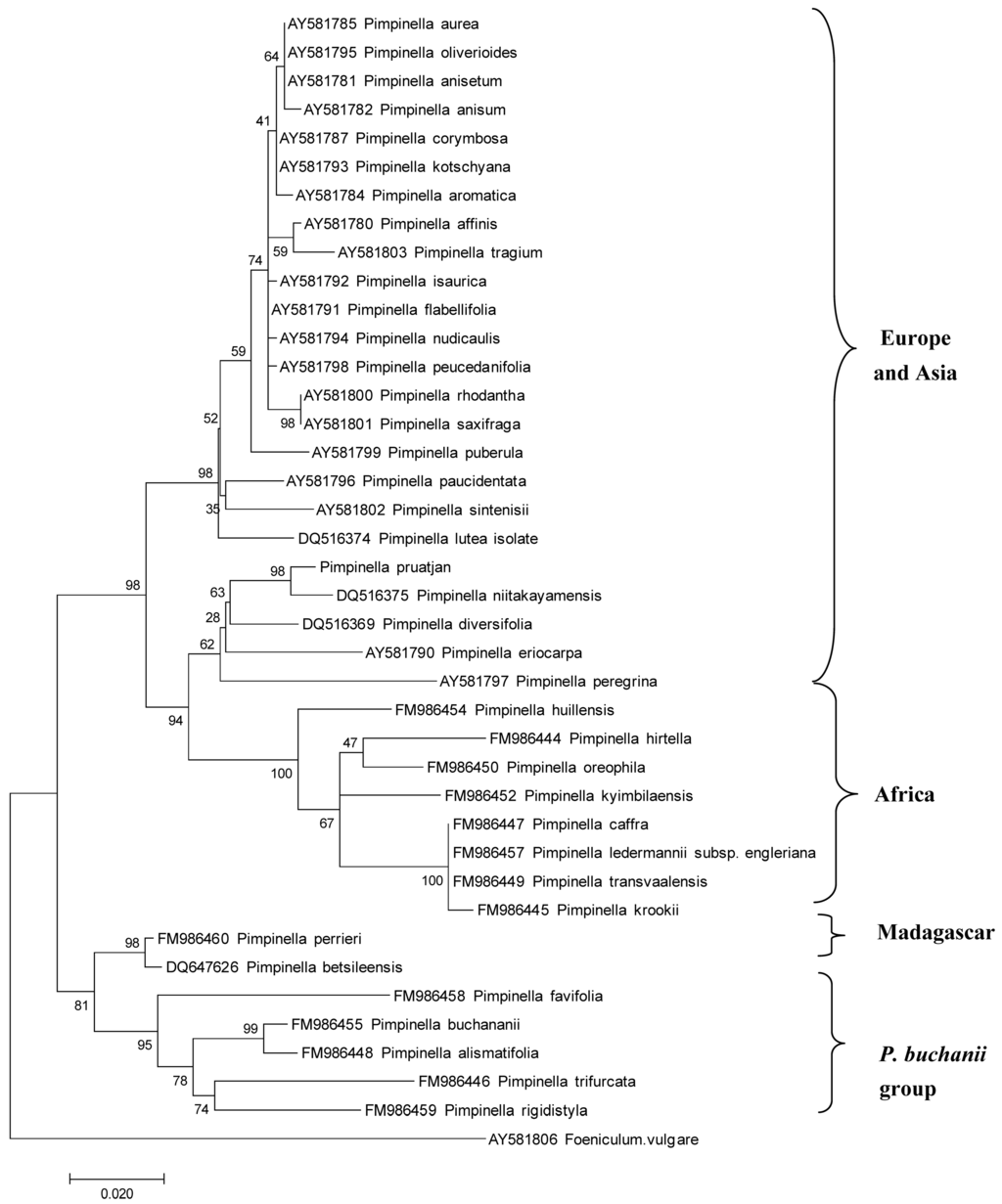 ITS sequences of P. pruatjan were used for DNA barcoding and to investigate the genetic relationship of P. pruatjan with other Pimpinella species distributed in Europe, Asia, and Africa. The phylogenetic analyses were based on a representative sampling of the genus Pimpinella, which includes 16 accessions from Africa and Madagascar and 26 from Eurasia. Another Apiaceae, Foeniculum vulgare served as an outgroup for the phylogeny reconstruction.