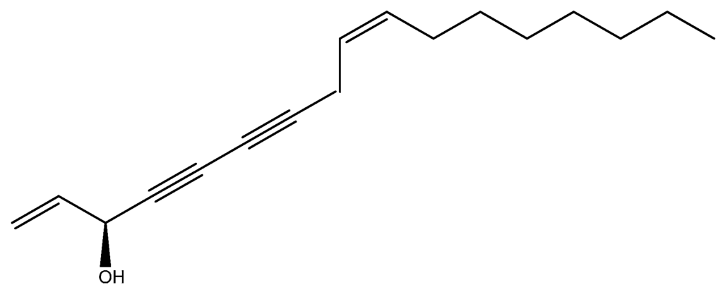 We detected a C17-polyacetylene, falcarinol (Figure 2) in the EO of P. pruatjan for the first time in the genus Pimpinella. Other polyacetylenes have been reported to be present in some Pimpinella species, such as those of pentadeca-2,4,6,8-tetraene, 2,8-decadiene-4,6-diene-1-al, 2,8-tridecadiene-4,6-diene-10-ol in P. major L., 2,8,10-tridecatriene-4,6-diene in P. major L. and P. anisum L., 2-tridecaene-4,6-diene-8-ol-10-on in P. major L. and P. saxifraga L. [30]. The pathway leading to polyacetylene is common to this genus and the occurrence of falcarinol is perhaps due to the modification of the polyacetylene biosynthesis or species specific of their enzymatic machinery.