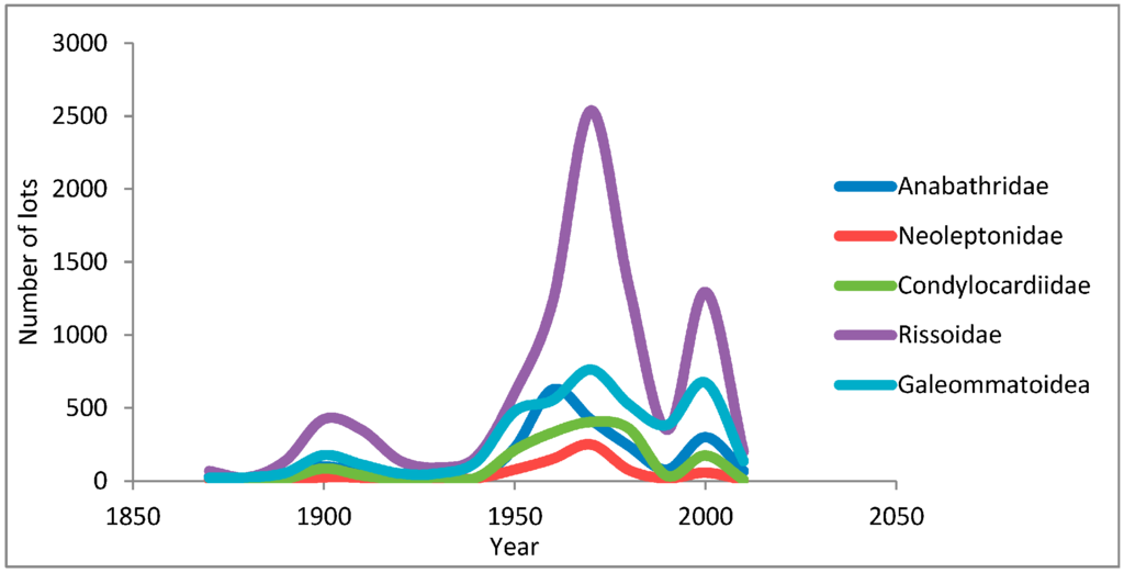 Although many papers argue that taxonomic expertise is diminishing [,], the occasional paper holds the opposite opinion—that there are more taxonomists than ever before []. The idea that the golden age of taxonomy peaked in the 1970s holds true when examining collecting activity in databases, such as the Atlas of Living Australia (ALA). Collection activity encompasses collection effort, sorting, identification, and databasing. Examination of the year of collection over the past century for a diversity of micromolluscan families (exemplars chosen here to reflect gastropods and bivalves, highly diverse, and less diverse groups, as well as better known and less well known groups) according to the Australian Faunal Directory [] reveals a disturbing trend (Figure 2). Although highs and lows are apparent, with a pronounced peak in the 1970s and a smaller peak in 2000, at 2010 we observe a low not seen since the 1930s. This unfortunate trend is not exclusive to micromolluscs; macromollusc groups also exhibit a similar downward progression.