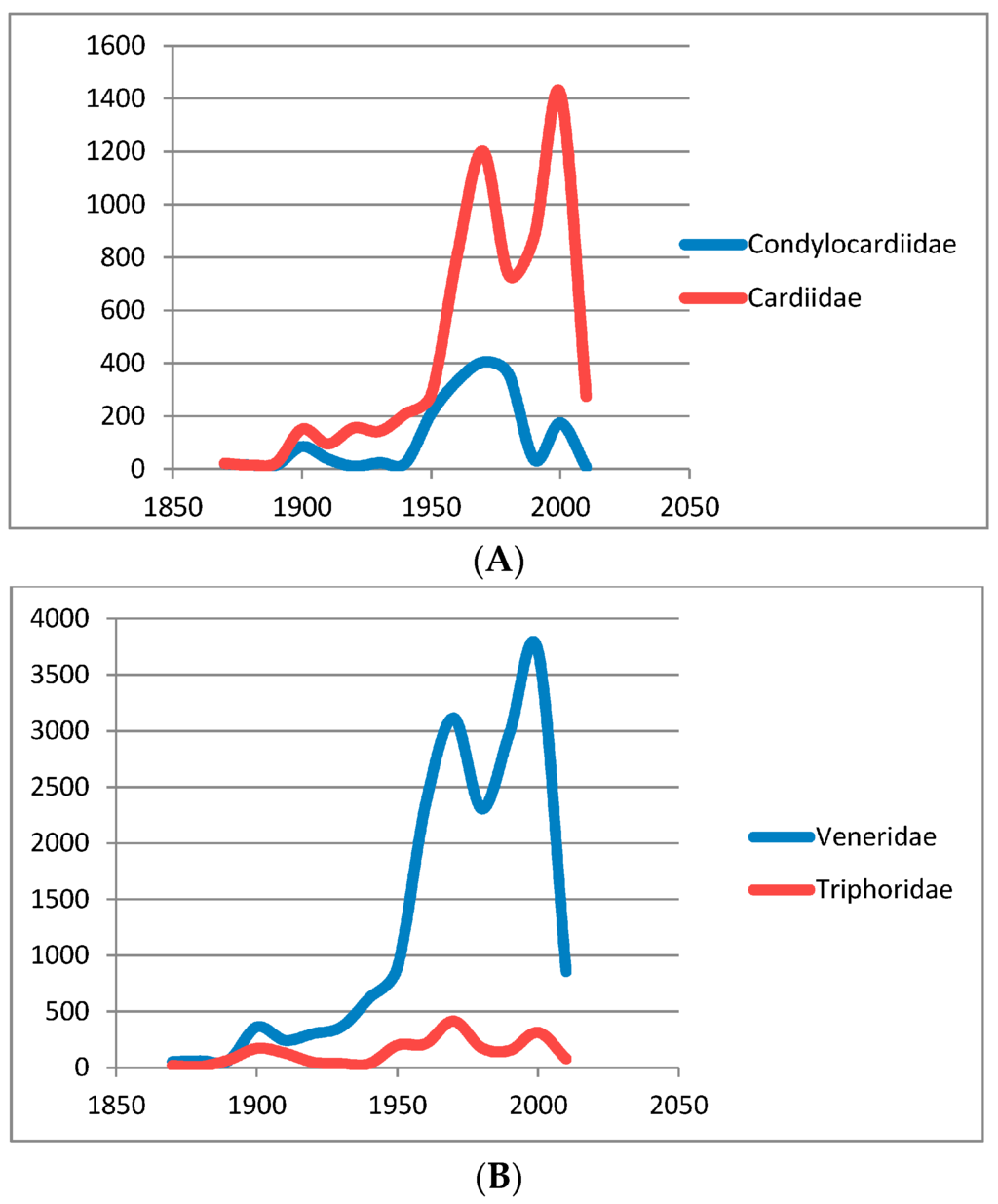 A micromollusc bias. (A) Comparison of Condylocardiidae and Cardiidae collection activity per decade in Australia; and (B) comparison of Veneridae and Triphoridae collection activity per decade in Australia [].