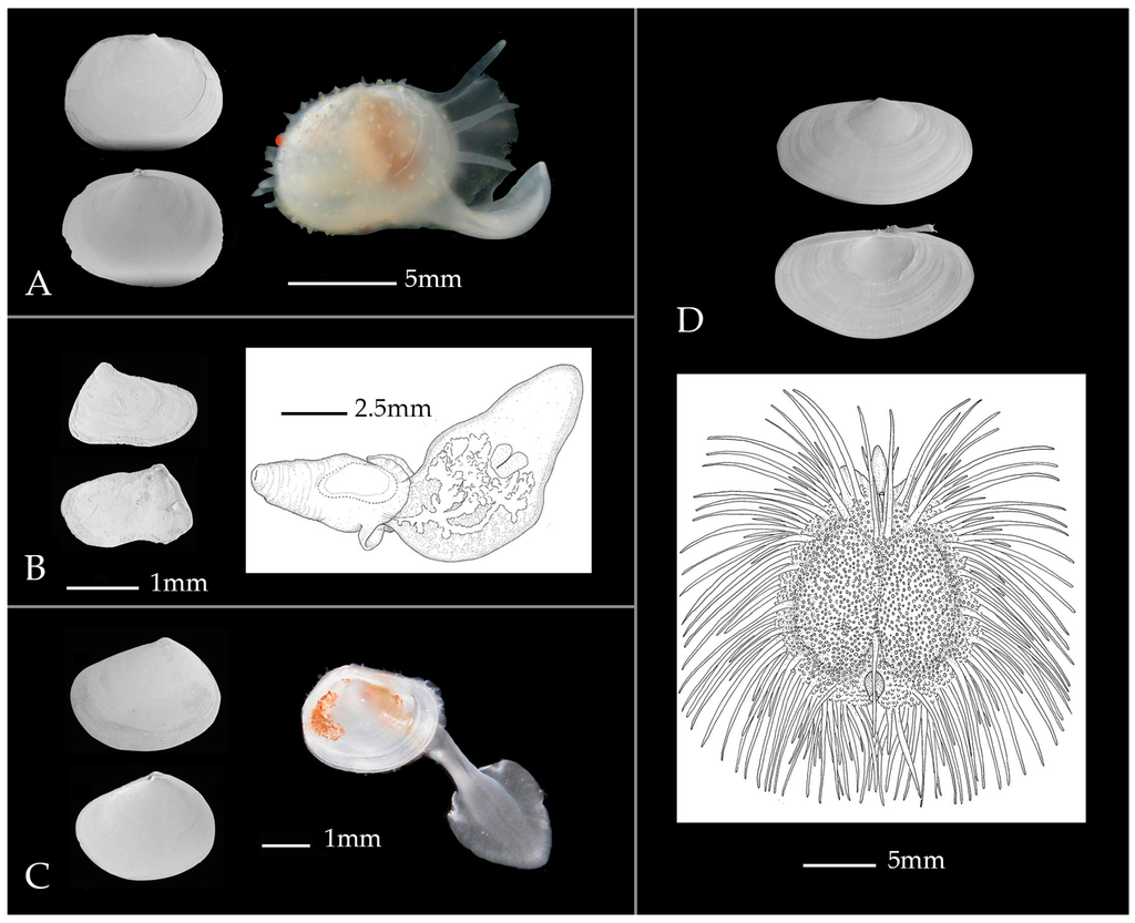 Simple shells and complex animals in species of Galeommatoidea from Eastern and Northeastern Australia. (A) Scintilla anomala; (B) Entovalva sp.; (C) Austrodevonia sharnae; and (D) Ephippodontomorpha hirsutus.