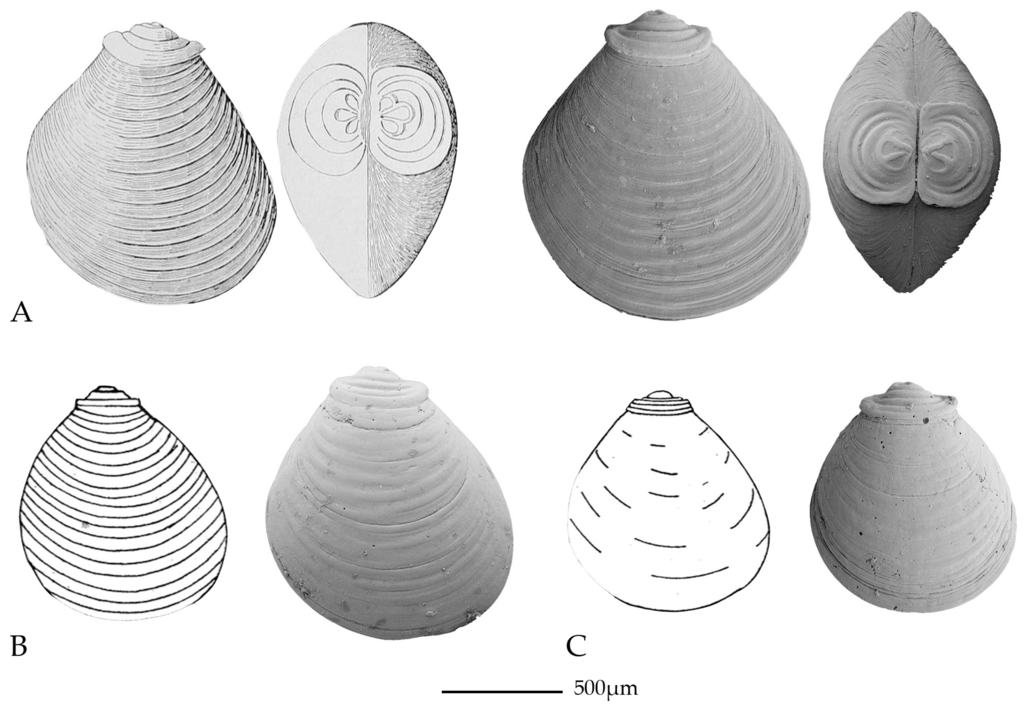 The utility of SEM for harvesting rich micromolluscan character data. Synonymised types of Austrocardiella trifoliata (from []). (A) Original drawings of Condylocuna trifoliata (from []); (B) Condylocuna cambrica (in []); and (C) Benthocardiella vitrea (from []), compared with SEM [].