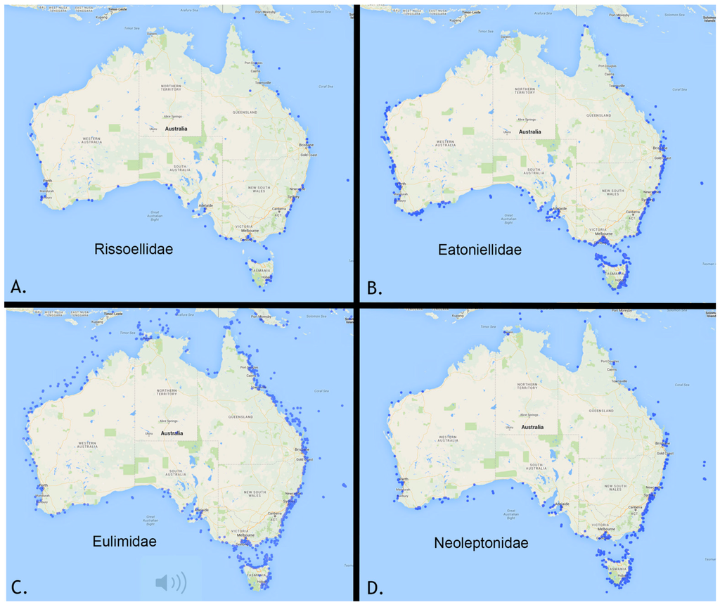 Regional biases for micromolluscs in Australia. An east coast bias is apparent in some groups (e.g., (C) Eulimidae; and (D) Neoleptonidae) while a southern bias (e.g., (B) Eatoniellidae) typifies the trend in others. Some groups have received little attention Australia-wide (e.g., (A) Rissoellidae). The highly diverse tropical reefs have overall received less attention than temperate ecosystems. Each dot represents an identified lot in a collection in Australia [].