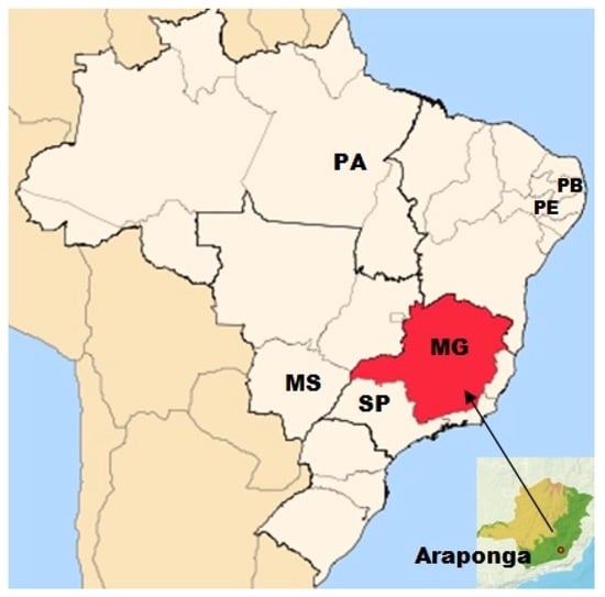 Map shows the six geographical states in Brazil, where the original plant materials were obtained. MG = Minas Gerais; SP = São Paulo; MS = Mato Grosso do Sul; PA = Pará; PE = Pernambuco; PB = Paraiba. Araponga is a city in MG State, where the genebank is situated in which the experimental plant materials were collected.