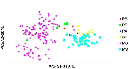 Collections from MG, represented the largest group in the study composed of five provenances (NMG, SMG, CMG, EMG, and WMG) (Table 1), clearly separated from the rest of the groups. Likewise, accessions from MS and SP formed the second group, while the third group composed of accessions from the regional States of PB and PE (Figure 2). The PCoA depicted the complete distinctness of MG collections, the genetic similarity between accessions from PA, SP, and MS and the genetic relatedness between PB and PE collections. Hence, formation of the different groups reiterated the presence of diverse genetic variability among the germplasm collections in the genebank.