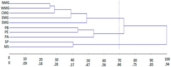 UPGMA dendogram of ten Acrocomia aculeata provenances constructed from genetic distance []. Provenances: PA = Pará; PE = Pernambuco; PB = Paraiba; SP = São Paulo; NMG = North Minas Gerais; SMG = South Minas Gerais; CMG = Central Minas Gerais; EMG = East Minas Gerais; WMG = West Minas Gerais; MS = Mato Grosso do Sul. The first row numbers from 0–100 are percentages of dissimilarity; and the second row numbers from 0–0.94 are levels of fusion (average genetic distance) corresponding to percentage of dissimilarity.