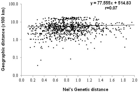 A Mantel test was applied using the Pearson correlation to test the hypothesis of relationships between genetic and geographic distances among A. aculeata accessions obtained from different regional states in Brazil. Analysis of Molecular Variance (AMOVA) was done to estimate the amount of genetic variation among and within the populations/or provenances. Φ-Statistics (Equations (8)–(10)) were computed to test the null hypothesis ( = == 0), where are genetic variations among provenances, among populations, and among individuals, respectively [,]. The computed Φ-values were compared against values obtained under 1000 permutations for significance tests. Data analyses were performed using GENES [] and GenAlex [] statistical software programs.