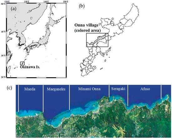 Study site maps: (a) Okinawa Island, Japan; (b) Onna Village on Okinawa Island; (c) five sectors, which are distinguished with channels, along the Onna coast.