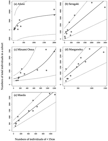 Best-fit model with 95% confidence intervals for the relationship between the numbers of removed individuals <15 cm and the total number of removed individuals in the same cohort of Acanthaster cf. solaris for five sectors along the Onna coast, Okinawa, Japan. (a) Afuso; (b) Seragaki; (c) Minami Onna; (d) Maeganeku; (e) Maeda.