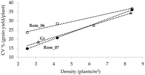 The positive association of CV for single-plant grain yield with density depicted in two groups of seven hybrids, the first across two seasons (Rom_06, and Rom_07) and the second for a single season (Gr). Data from Tokatlidis et al. [].