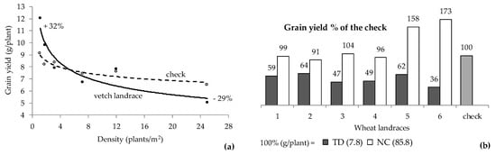 The performance of heterogeneous landraces against respective homogeneous checks, (a) across a range of densities; and (b) at typical density (TD) and nil-competition (NC), indicate that high yielding genotypes involved in a landrace are expressed and detectable only at NC. Adapted from (a) Chatzoglou and Tokatlidis [] and (b) Ninou et al. [].