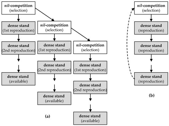 The current practice of propagation absolutely at crop densities creates a crucial barrier to deal with landrace genetic diversity. Intra-species competition plays a suspending role in identifying individual genotypes of high plant yield efficiency. To counteract the issue, the landrace seed need to be treated following a nil-competition regime that maximizes the phenotypic expression and differentiation [,,,,], which is a prerequisite to identify the within-landrace genetic differences in order to remove inferior plants and to select the superior ones. Within a rye population of about 2000 plants either densely grown or under nil-competition conditions mass selection was applied at three selection pressures: the selection of 14.3%, 5.3%, and 1.6% of the highest yielding plants []. With intensifying pressure (by reducing the selection rate), the selection response increased under nil-competition conditions (4.1%, 5.4%, and 9.0%, respectively) while it declined (becoming even negative) under dense stand conditions (0.3%, −3.7%, and −5.2%, respectively), thereby highlighting the obstructive influence that intra-species competition exerts on genotypes of high yield potential.