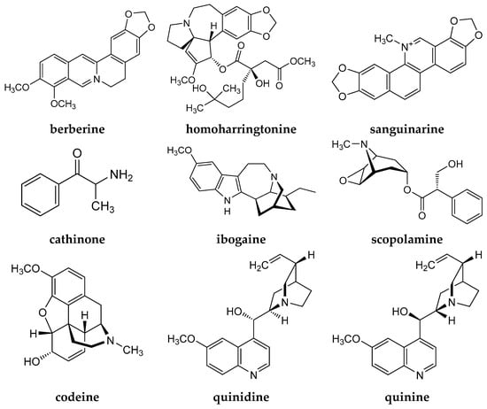 Alkaloids and extracts of alkaloid-containing plants have been used throughout human history as remedies, poisons and psychoactive drugs. Many alkaloids have diverse and important physiological effects on humans, animals, and even insects. Some of them are therefore used in medicine, veterinary medicine, or agriculture. Alkaloids have a wide range of pharmacological activities including antitumor (berberine, homoharringtonine, sanguinarine, vinblastine, vincristine), stimulant (caffeine, cathinone, cocaine), hallucinogenic (dimethyltryptamine, ibogaine, mescaline, psilocybin), anticholinergic (atropine, hyoscyamine, scopolamine), analgesic (codeine, morphine), antiarrhythmic (allapinin, quinidine) and antimalarial activities (quinine) [,,,,] (Figure 1). Therefore, some alkaloids are widely used in medicine to treat health disorders and infections.