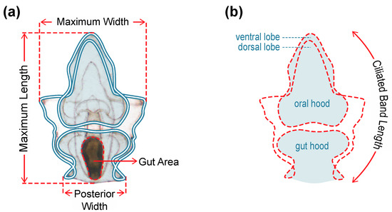 Morphometric measurements of larvae taken four and ten days after commencement of feeding: (a) size of morphological features; (b) Ciliated band length = sum of the traced perimeter measurements of the oral hood and ventral lobe, gut hood, larval sides, and dorsal lobe (red dashed outline).