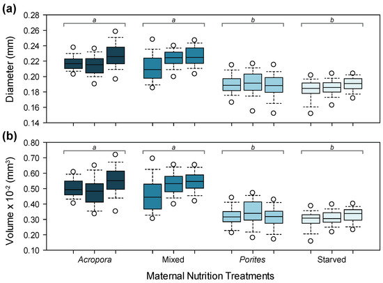 Size of oocytes from female starfish under different maternal nutrition treatments: (a) oocyte diameter; (b) oocyte volume. Boxplots with different letters above are significantly different.