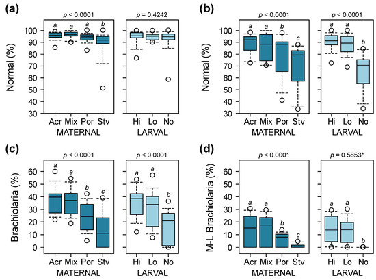 Proportion of normally developing larvae at 8 days (a) and 16 days (b) after the onset of the ability of larvae to feed, and proportion of larvae at the brachiolaria stage after 8 days (c) and larvae at the mid-to-late (M-L) brachiolaria stage after 16 days (d). p-values are from overall binomial GLMs and different letters are significantly different based on post hoc pairwise comparisons (* p-value for comparison between high and low algal food treatments only; starved larvae not included in analysis due to zero variance).