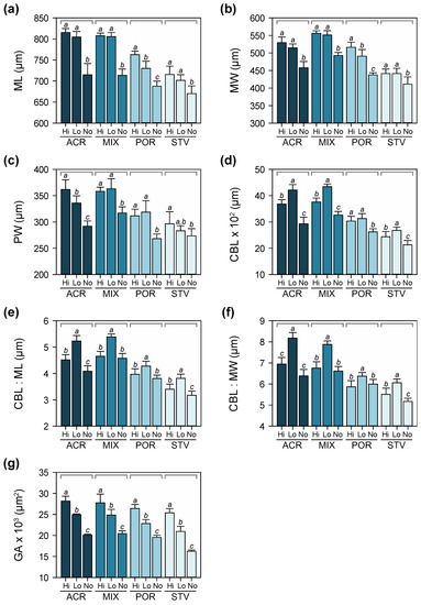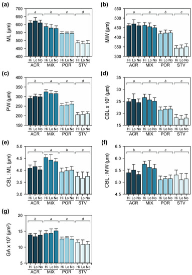 Morphometric measurements of larvae (± SD) at Day 4: (a) maximum length (ML), (b) maximum width (MW), (c) posterior width (PW), (d) ciliated band length (CBL), (e) ratio of CBL to ML, (f) ratio of CBL to MW, and (g) gut area (GA). Letters above bars denote significant differences as determined by Tukey’s post hoc tests following two-way ANOVA.