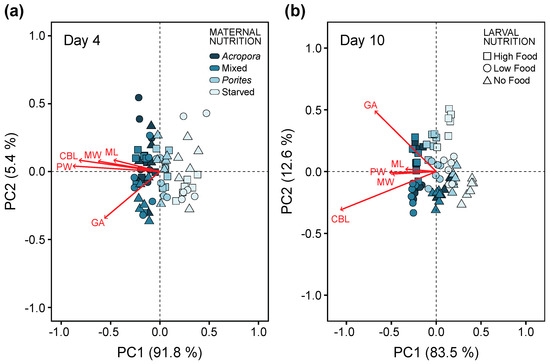 Principal component analysis (PCA) plot of morphological traits measured to analyze similarities in larval morphology at (a) four days and (b) ten days after the onset of feeding ability. Red vectors are morphometric measurements of maximum length (ML), maximum width (MW), posterior width (PW), ciliated band length (CBL), and gut area (GA). Maternal nutrition treatments are indicated by different colors and larval feeding treatments are indicated by symbols. Individual data points are average values from 10 replicate larvae per experimental bottle.