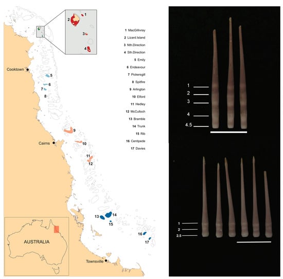 Great Barrier Reef study region reefs sampled for crown-of-thorns starfish (CoTS; Acanthaster spp.), October 2013 and September 2014 (left panel). Reefs are colored according to region. Spines selected for band counting from two starfish (right panels), showing distinct banding counts from 1 to 4.5 (top panel) and 1 to 2.5 (bottom panel), scale bar represents 1 cm.