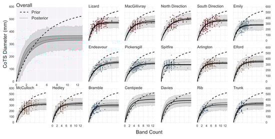 Bayesian hierarchical von Bertalanffy model posterior fit for the relationship between band counts and observed diameter of CoTS collected in the Great Barrier Reef CoTS initiation box, 2013–2014. Overall (grey panel, upper left) hierarchical posterior median von Bertalanffy curve (dotted line), 50% (dark grey area), and 95% (light grey area) uncertainty intervals (given highest posterior density); overall prior curve (dashed line) is from previous age and growth studies reported in [5]. Hierarchical model fits for each study reef (white panels) show inter-reef variation in posterior median curved (black lines) and uncertainty intervals, with points representing samples from the northern initiation box (red), central initiation box (light blue), southern initiation box (tan), and southern outbreak edge (dark blue).