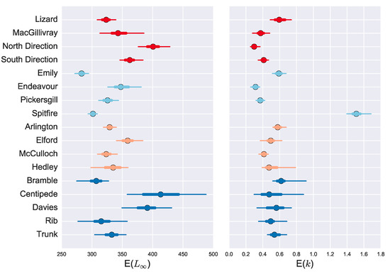 Inter-reef variation in bothand k was substantial, with non-overlapping 95% uncertainty intervals both within and among sampling regions (Figure 3). As expected, the correlation between and k was high, averaging −0.78 among reefs; however, posterior traces from the NUTS algorithm showed no evidence for lack of convergence and the overall (global)and k estimates were uncorrelated (−0.01). Individual reef estimates for ranged between 283 mm (Emily Reef) and 415 mm (Centipede Reef), with the majority lying around 340 mm; reef estimates of k ranged between 0.30 (North Direction Reef) and 1.5 (Spitfire Reef), averaging 0.54 overall.