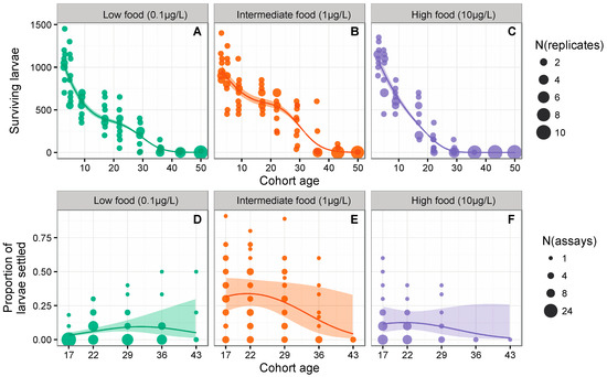 Non-linear effects of increasing food availability on larval survivorship and settlement for crown-of-thorns starfish (Acanthaster cf. solaris) from Australia’s Great Barrier Reef: (A–C) Absolute larval survivorship between 1 and 50 days post-fertilization for each of ten replicate cultures maintained at low (0.1 µg·L−1), medium (1.0 µg·L−1) or high (10 µg·L−1) chlorophyll concentrations; (D–E) Proportion of larvae (n = 10–30 per culture) that successfully settled 17, 22, 29, 36 and 43 days post-fertilization for each of the ten replicate cultures maintained at low (0.1 µg·L−1), medium (1.0 µg·L−1) or high (10 µg·L−1) chlorophyll concentrations. Lines show the predictions from the GAMMs fit to the survival data (A–C), and from the GLMMs fit to the settlement data (D–F); shaded areas depict 95% confidence intervals (all panels).