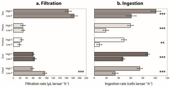 Filtration and ingestion rates for larvae fed with one algal species. Predicted filtration (a) and ingestion (b) rates of larvae fed with five different species. Predictions are made using GLMM models. High treatment represents an initial concentration of 2500 cells·mL−1 and low treatment an initial concentration of 1000 cells·mL−1. The error bars represent the 95% confidence intervals. Asterisks represent significantly different rates between low- and high-concentration treatments (Student’s t-test; *: p < 0.05, **: p < 0.01; ***: p < 0.001). Tiso: Tisochrysis lutea; Phaeo: Phaeodactylum tricornutum; Pavlova: Pavlova lutheri; Dun: Dunaliella sp.; Chaet: Chaetoceros sp.