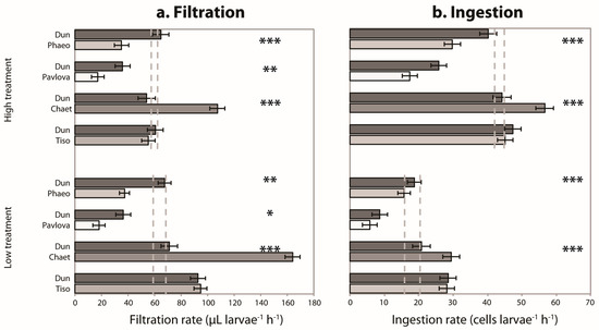 Filtration and ingestion rates for larvae fed with a 1:1 mixture of two algae species. Predicted filtration (a) and ingestion (b) rates for each of the two algae for the four food mixtures. Predictions are made using GLMM models. High treatment represents an initial concentration of 2500 cells·mL−1 (1250 cells mL−1 of each species) and low treatment an initial concentration of 1000 cells·mL−1 (500 of each species). The error bars represent the confidence intervals. The grey dotted lines represent the predicted 95% confidence interval of filtration and ingestion rates for larvae fed with Dunaliella sp. alone (filtration rate for 2500 and 1000 cells mL−1, half of the ingestion rate for 2500 and 1000 cells·mL−1 of Dunaliella sp.). Asterisks represent significantly different rates between Dunaliella sp. and the second species (Student’s t-test; *: p < 0.05, **: p < 0.01; ***: p < 0.001). Tiso: Tisochrysis lutea; Phaeo: Phaeodactylum tricornutum; Pavlova: Pavlova lutheri; Dun: Dunaliella sp.; Chaet: Chaetoceros sp.