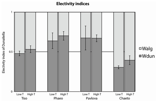 Electivity indices for larvae fed with a 1:1 mixture of two algal species. Mean electivity index for each of the for food mixtures. High treatment (High T) represents an initial concentration of 2500 cells·mL−1 (1250 cells mL−1 of each species). Low treatment (Low T) corresponds to an initial concentration of 1000 cells·mL−1 (500 of each species). The lower bars (Wdun, dark grey) represent the electivity for Dunaliella sp. and the upper bars (Walg, light grey) represent the electivity for the second algae present in the mixture. Electivity “Wdun” above 0.5 (grey dotted line) indicates that the larvae selectively ingested Dunaliella sp. over the other species. The error bars are 95% confidence interval.