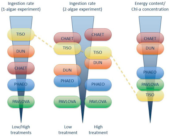 Conceptual synthesis of the results indicating relatively consistent ranking of the algal species based on ingestion rates (left and middle) and energy content (right), with the exception of Tisochrysis lutea (yellow). Overlapping bullets indicate non-significant differences (left and middle) or ambiguous ranking (right; e.g. Chaetoceros sp. had the highest energy content, but Dunaliella sp. had the greatest chlorophyll-a concentration; see Table 4 for details). Only Tisochrysis lutea showed an inverse ranking across gradients (as indicated by the dashed yellow line). TISO: Tisochrysis lutea; DUN: Dunaliella sp.; CHAET: Chaetoceros sp.; PHAEO: Phaeodactylum tricornutum; PAVLOVA: Pavlova lutheri.