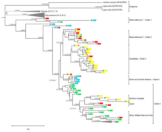 The maximally parsimonious tree based on nrDNA-ITS sequence data. The tree is drawn to scale, with branch lengths in the same units as those of the evolutionary distances used to infer the phylogenetic tree. Numbers on branches indicate posterior probabilities or bootstrap values for Bayesian analyses/parsimony analysis/maximum likelihood. Ribotypes are terminal taxa and details for them are given in Table S1 and Figure 2 and Figure 3. Colour coding matches the global colour scheme in Figure 3 and the bandwidths are not informative. AF437853 = Lantana camara. Five clades, 1–5 are recognised.