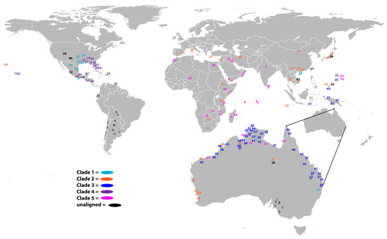 The global distribution of the 64 ribotypes discovered for Phyla nodiflora (numbers), the eleven ribotypes discovered for P. canescens (A-H, K, M, U) and five ribotypes (unaligned) from an undetermined taxa or taxon within Phyla (Q-T, X). Underlined numbers represent multiple collections of that ribotype from that location area. Phyla nodiflora ribotypes with clade support are coloured according to clade number on Figure 1 or if unaligned they are in black notation. Further details of ribotypes are given in Table S1.
