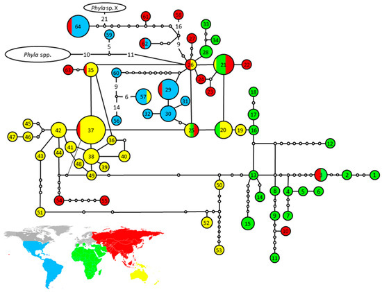 A parsimony network of the ribotypes derived from the ITS region in P. nodiflora revealed a complex structure within this species (Figure 3) and is in broad congruence with the phylogenetic analyses. Ribotypes of P. nodiflora were connected with 15 or more evolutionary steps to the ribotypes of other species of Phyla. Several loops (homoplasies or recombination) were detected within the parsimony network, indicating low resolution in the ITS sequence data or recombination.
