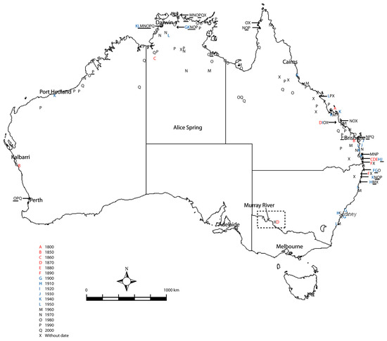 Against Criterion 6 and Clade 3 in Australia, most of the Australian populations are associated with tropical habitats and freshwater or coastal dune systems. For Criterion 7, Phyla nodiflora is most closely related to the South American P. canescens [6]. Kennedy [6] also considers the North American species P. cuneifolia (Torr.) Greene to be closely related to P. nodiflora while O’Leary and Múlgura [7] consider that P. nodiflora is the taxon most similar morphologically to P. lanceolata (Michx.) Greene. Phyla canescens is a highly invasive herb in Australia [18,47,48,49] whereas P. cuneifolia, P. fructicosa and P. lanceolata are not listed as occurring in Australia (Australia’s Virtual Herbarium, accessed 26 February 2017). The taxa outside of Australia with the closest native range to P. nodiflora include the Latin American P. canescens, P. betulifolia (Kunth) Greene and P. fructicosa (= P. nodiflora var. reptans (Kunth) Moldenke, [7]) but none of these taxa is native to Australia’s near neighbours of New Guinea, Timor, Java or New Zealand. For Criterion 8 (Table 1) several islands in Asia (e.g., Guam) hold alien populations of P. nodiflora and are potential source areas for distribution into Australia. Gupta et al. [10] consider that P. nodiflora is native to the whole of Africa, temperate and tropical Asia, Australasia, Europe and tropical America and that it is wide-spread and locally common in “open and wet places near streams, ponds, paddy fields, ditches, backwaters, brackish water”. Location data taken from specimens of P. nodiflora were mapped against region and collection time revealing that P. nodiflora has a disjunct distribution in Australia (Figure 4). Populations are found in the north of Australia, with sparse occurrences along the east coast (C9b, Table 1). For Criterion 10 (Table 1) the earliest collection of P. nodiflora from Australia was made in 1802 by Robert Brown at Shoalwater Bay Qld (BM, Bennett No. 2335, image at NE) and is within the Clade 3 geographic distribution. At least a further 16 collections from the mid to late 1800s have been lodged in Australian herbaria, including collections from south-eastern Queensland. None of these areas in southern Queensland was unequivocally pristine at the time these specimens were collected. Captain James Cook for example, had made land in the Shoalwater Bay area in 1770 (late May-early June) where an expedition was made to Pier Headland, in the same vicinity that Robert Brown collected from some 32 years later in 1802. There is no record of a Banks and Solander collection of P. nodiflora from 1770 (specimen data from the Herbarium of New South Wales, Royal Botanic Gardens and Domain Trust, 21 February 2011) although botanical gatherings were made in the Shoalwater Bay area by them [50]. Three collections were made in the 1890s along the north coast of New South Wales. One herbarium specimen however, provides strong evidence for a pre-European occurrence of P. nodiflora in northern Australia (Mueller s.n. MEL 583741A). Mueller was the Botanist on the Gregory Expedition into Northern Australia (1855–1856) and in 1856 he wrote that he collected a ‘Lippia’ on that expedition [51], Appendix II in [52]. This is a significant finding as the Victoria River area that these explorers traversed at this stage of the Gregory Expedition was not settled and was unchartered territory at the time [53]. We did not find any records of its use as a medicinal plant by the Australian Aboriginal peoples.