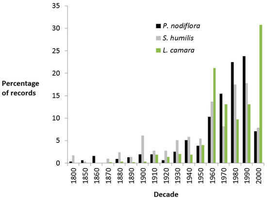 The distribution of Australian collection-records from eight herbaria (AD, BRI, CANB, CBG, HO, MEL, NSW, PERTH) plotted as a percentage of the collecting effort for each species and against time (decadal periods) for Phyla nodiflora (n = 311) Scutellaria humilis (n = 292) and Lantana camara (n = 595).