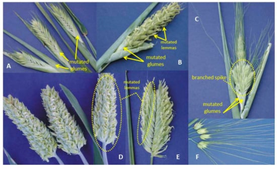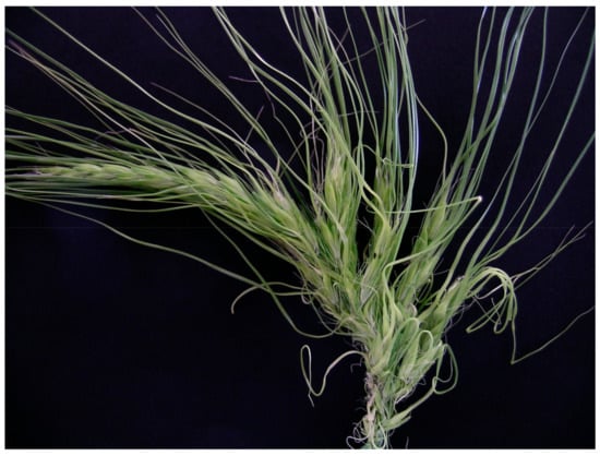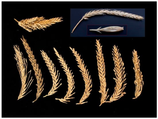- Poursarebani, N.; Seidensticker, T.; Koppolu, R.; Trautewig, C.; Gawroński, P.; Bini, F.; Govind, G.; Rutten, R.; Sakuma, S.; Tagiri, A.; et al. The genetic basis of composite spike form in barley and ‘Miracle-Wheat’. Genetics 2015, 115, 176628. [Google Scholar] [CrossRef] [PubMed]