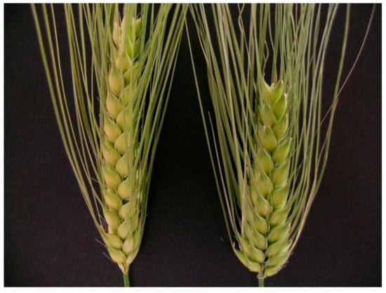 - Koppolu, R.; Anwar, N.; Sakuma, S.; Tagiri, A.; Lundqvist, U.; Pourkheirandish, M.; Rutten, T.; Seiler, C.; Himmelbach, A.; Ariyadasa, R.; et al. Six-rowed spike4 (Vrs4) controls spikelet determinacy and row-type in barley. Proc. Natl. Acad. Sci. USA 2013, 110, 13198–13203. [Google Scholar] [CrossRef] [PubMed]