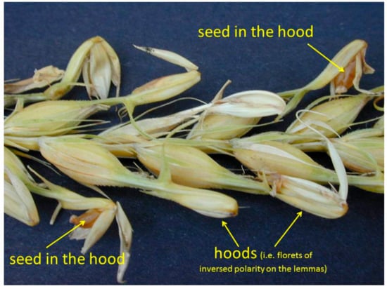 - Roig, C.; Pozzi, C.; Santi, L.; Müller, J.; Wang, Y.; Stile, M.R.; Rossini, L.; Stanca, A.M.; Salamini, F. Genetics of barley hooded suppression. Genetics 2004, 167, 439–448. [Google Scholar] [CrossRef] [PubMed]