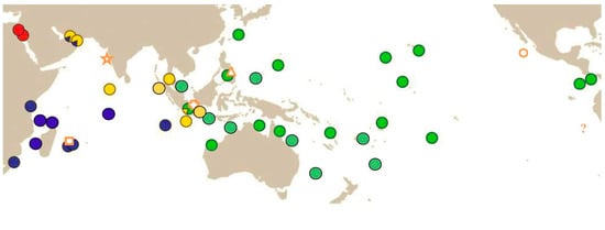 For more than 250 years, researchers have noticed morphological differences among specimens of COTS from different geographical areas. Indeed, a number of taxa have been proposed, and these have subsequently been merged again or split further (for a review, see []). Currently, only one other species aside from Acanthaster planci is uniformly accepted as valid within the genus, Acanthaster brevispinus Fisher, 1917 []. This species does not feed on coral and thus does not threaten coral reefs. Yet during the last 30 years, various molecular datasets have suggested that Acanthaster planci might be more than a single species [,,,,]. The most thorough molecular and phylogeographic study that included Acanthaster planci specimens across its entire Indo-Pacific distribution range (from the Red Sea to Mauritius and the Eastern Pacific) revealed no less than four deeply divergent clades []. The “barcoding fragment” of the mitochondrial COI gene showed high inter-clade divergence (8.8–10.6%) compared to <0.7% intra-clade divergence, strongly suggesting that Acanthaster planci represents a species complex with four different species instead of a single one []. These species (and we use the term “species” henceforth) show distinct geographical distribution patterns across the Indo-Pacific: one species might be restricted to the Red Sea, one occurs in the Northern Indian Ocean, another one mainly in the Southern Indian Ocean (with the exception of Northern Oman), and the fourth species shows a pan-Pacific distribution (Table 1; Figure 1, references [,,]). Moreover, the Pacific species shows some internal phylogeographic structure [,,], accordingly it cannot be excluded that additional (sub-)species be discovered here in the future using higher-resolution molecular markers, such as SNPs.